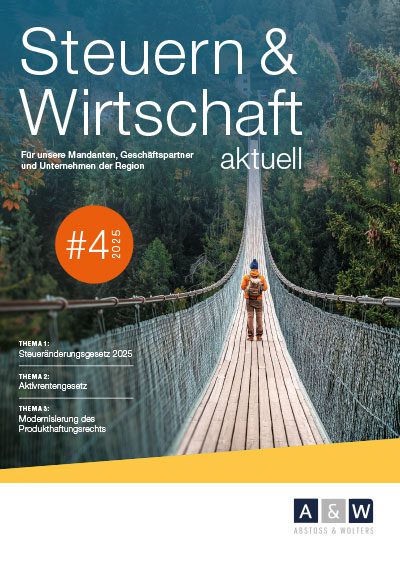 Aus der Flut an steuer- und gesellschaftsrechtlichen sowie betriebswirtschaftlichen und prüfungsrelevanten Neuerungen und Änderungen versuchen wir, das für Sie Wesentliche und Praxisrelevante herauszufiltern und in unserem regelmäßig erscheinenden A&W Magazin „Steuern & Wirtschaft aktuell“ zusammenzufassen. Zudem finden Sie immer auf der vorletzten Seite Aktuelles aus unserem Haus. Wir wünschen Ihnen eine informative Lektüre beim „online blättern“ – zusätzlich stehen Ihnen die Mandanteninformationen auch zum Download zur Verfügung.